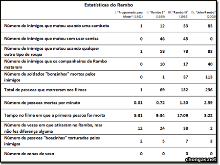 Faltaram só mais algumas estatísticas do tipo, quantos matou com armas de fogo e quantos com a famosa faquinha… Mas estão aí umas estatísticas no mínimo curiosa sobre todos os filmes do Rambo.